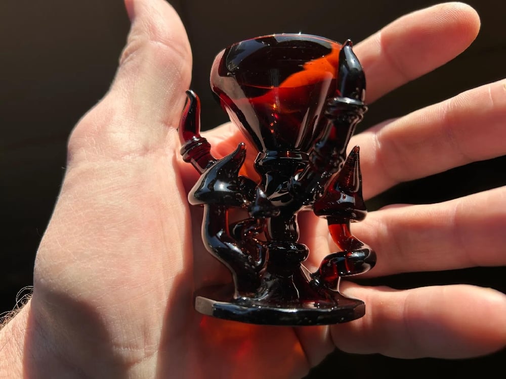 Americano is a dark coffee brown glass with subtle red undertones. The color develops evenly when annealed at 1050°F. Working in a reduced flame deepens the brown and helps maintain the underlying red warmth without muddying the surface.