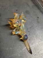 Starts as a transparent yellow and develops into soft pinks, eventually reaching purple tones if struck long enough. Color develops in the kiln around **1075°F**, with final results depending on thickness and layering. The color may appear to clear when brought to a fully molten state; reheating will restart the striking process. Works well without needing incased and does performs best in a normal oxidizing flame